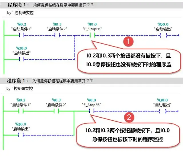 这段程序,启动条件1(I0.2)和启动条件2(I0.3)都是以常开状态接入PLC的两个按钮,而急停按钮(E_StopPB)则是以常闭状态接入PLC的按钮!---从图片上的圆圈①可以看到,3个按钮都没有按下的时候,只有E_StopPB是接通的,当三个按钮都按下时即圆圈②处,启动条件1和2的两个状态接通了,而E_StopPB的状态则是显示断开!