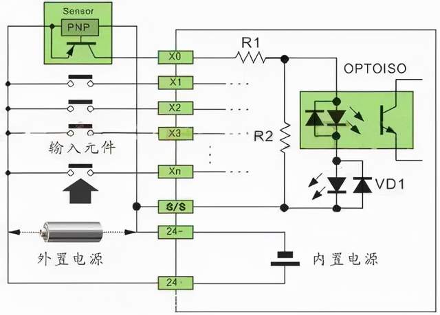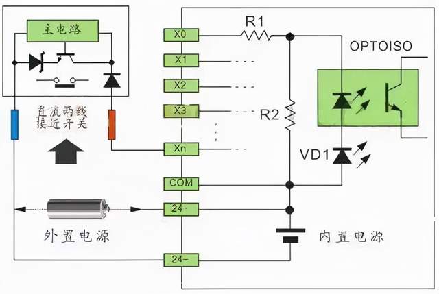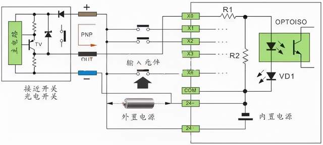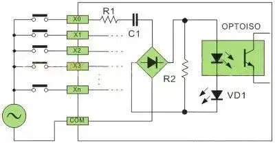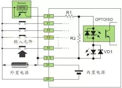 一、概述 PLC 的数字量输入接口并不复杂,PLC 为了提高抗干扰能力,输入接口都采用光电耦合器来隔离输入信号与内部处理电路的传输。因此,输入端的信号只是驱动光电耦合器的内部 LED 导通,被光电耦合器的光电管接收,即可使外部输入信号可靠传输。
