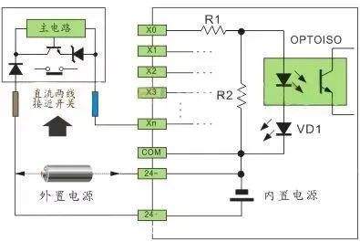 以上的情况只是针对,传感器是属于常开的状态下。 3、按电源配置类型 (1) 直流输入电路 如图1,直流输入电路要求外部输入信号的元件为无源的干接点或直流有源的无触点开关接点,当外部输入元件与电源正极导通,电流通过R1,光电耦合器内部LED,VD1(接口指示)到COM端形成回路,光电耦合器内部接收管接受外部元件导通的信号,传输到内部处理;这种由直流电提供电源的接口方式,叫直流输入电路; 直流电可以由PLC内部提供也可以外接直流电源提供给外部输入信号的元件。R2在电路中的作用是旁路光电耦合器内部LED的电流,保证光电耦合器LED不被两线制接近开关的静态泄漏电流导通。