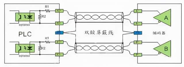 (5) 当有源输入元件(霍尔开关、接近开关、光电开关、光幕传感器等)数量比较多,消耗功率比较大,PLC内置电源不能满足时,需要配置外置电源。根据需求可以配24VDC,一定功率的开关电源。外置电源原则上不能与内置电源并联,根据COM与外部共线的特点, SINK(sink Current 拉电流)输入方式时,外置电源与内置电源正极相连接;SRCE(source Current 灌电流)输入方式时,外置电源与内置电源负极相连接。 (6) 简单判断SINK(sink Current 拉电流)输入方式,只需要Xn端与负极短路,如果接口指示灯亮就说明是SINK输入方式。共正极的光藕合器,可接NPN型的传感器。SRCE(source Current 灌电流)输入方式,将Xn端与正极短路,如果接口指示灯亮就说明是SRCE输入方式。共负极的光藕合器,可接PNP型的传感器。 (7) 对于2线式的开关量输入,如果是无源触点,SINK与SRCE按上图的输入元件接法,对于2线式的接近开关,需要判断接近开关的极性,正确接入。我公司部分2线式的LJK系列接近开关也有不分极性即可接入接口的,具体参考附带产品说明书。 (8)超高速双端输入电路 主要用于硬件高速计数器(HHSC)的输入使用,接口电压为5VDC,在应用上为确保高速及高噪音抗性通常采用双线驱动方式(Line-Drive)。如果工作频率不高与噪音低也可以采用5VDC的单端SINK或者SRCE接法,串联一个限流电阻转换成24VDC的单端SINK或者SRCE接法。 (9)、双输入端双线驱动方式(Line-Drive)。