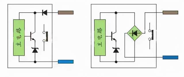 注:24VDC供电的传感器,在输入回路上需要串联限流电阻,R1为10Ω,R2为2KΩ,不串联限流电阻,将烧毁接口回路,限流电阻取值2.7KΩ。 三、外部输入元件 1、无源干接点(按钮开关、行程开关、舌簧磁性开关、继电器触点等) 无源干接点比较简单,接线容易。不存在电源的极性,压降等因素,上图3-6中的输入元件这是此类型。这里不重复介绍。 2、有源两线制传感器(接近开关、有源舌簧磁性开关) 有源两线接近开关分直流与交流,此传感器的特点就是两根线,传器输出端导通后,为了保证电路正常工作需要一个保持电压来维持电路工作,通常在3.5-5V的压降,静态泄露电流要小于1mA,这个指标很重要;如果过大,在接近开关没检测信号时,就使PLC的输入端的光电耦合器导通。我公司的LJK系列两线制接近开关静态泄露电流控制在0.35-0.5mA之间适应各类型PLC。 直流两线制接近开关分二极管极性保护与桥整流极性保护,前者在接PLC时需要注意极性,后者就不需要注意极性。有源舌簧磁性开关主要用在汽缸上做位置检测,由于需要信号指示,内部有双向二极管回路,因此也不需要注意极性;交流两线制接近开关就不需要注意极性。如图10: