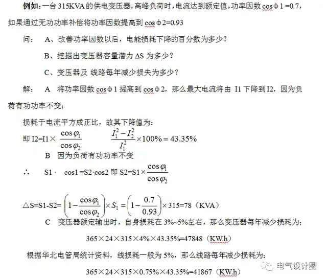 降低线路及变压器损耗,节约有功电度,是重要的节能措施。如在石油行业中,线路比较长,而且比较复杂,那么可以通过增加无功补偿设备来降低运行电流,从而降低线路损耗,节约有功电度,节能效果明显。 3) 增加电网的传输能力,提高设备利用率 由于补偿装置可以有效的降低系统电流和视在功率,故可以有效的降低电网建设中所有相关设备的容量,从而降低电网建设中的投资。功率因数在0.7左右的系统,由于有效的补偿可使系统电流下降30%,即提高发电厂、变配电设施30%的带载能力。 如果变压器及线路小容量不足时,可以通过安装无功补偿装置的方法解决。安装无功补偿装置可以使无功功率就地平衡,从而减小流过线路及变压器的电流,减缓导线及变压器的绝缘老化速度,延长使用寿命。同时可以释放变压器及线路的容量,增加变压器及线路带负荷能力。 如,有一台100KVA变压器,目前负载率为85%,COSΦ=0.7。如果加装无功补偿设备,可使变压器释放30%的带载量,用户可在变压器不增容的情况下,增加负载,进行扩大再生产。 4) 改善电压质量 由于系统存在的大量感性负载将造成供电线路压降,尤其在供电线路末端更为严重,通过合理的补偿可以有效的缓解线路压降,改善电能质量。 线路中的电压损失的计算公式如下: