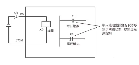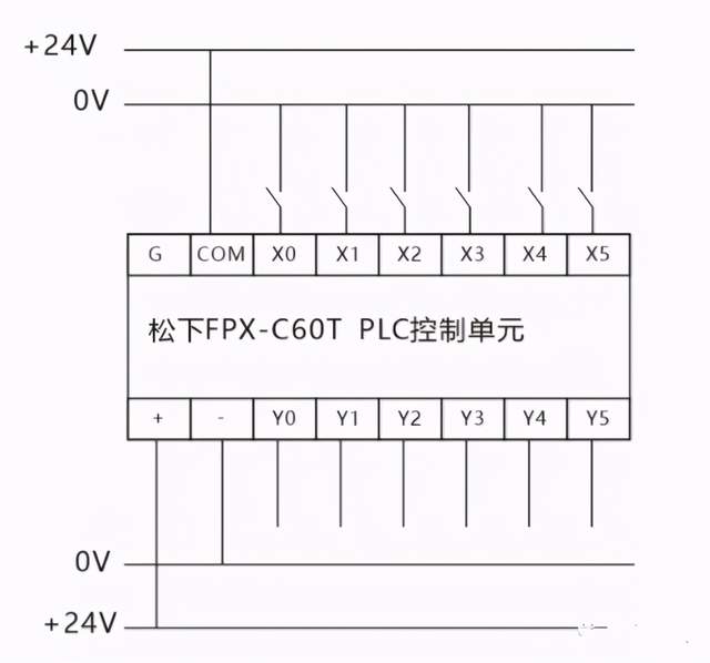 图中松下PLC为直流汇点式输入,即所以输入点共用一个公共端COM,同时COM端内带有DC24V电源,在编写程序时注意外部设备使用的是常闭还是常开触点。