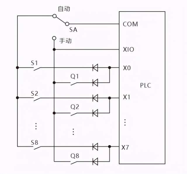 如图上系统分自动和手动两种工作方式,Q1-Q8为手动方式用到的 输入信号,S1-S8为自动方式用到的输入信号。S1和Q1共用输入点X0,PLC运行时只会用到其中一组信号,所以可以共用PLC的输入点。(图中二极管是用来防止寄生回路,避免错误输入信号的产生。)