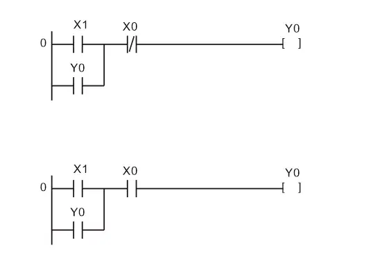 I/O分配SB0-X0,SB1-X1,输出K0-Y0。当外部使用长闭触点,不操作该按钮,输出Y0正常接通,在PLC控制系统中,外部开关无论是启动还是停止一般都选用常开型。