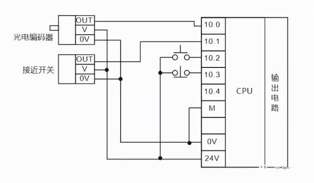 直流有源输入输入信号一般都是24V,这类信号与其他无源开关量信号混合接入PLC输入点时电压的0V点一定要接。上图输入点I0.0,I0.1连接光电编码器,接近开关的输出OUT信号,它们的驱动电源由PLC自身的24V电压提供。