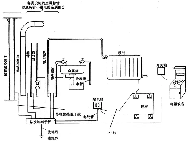 局部等电位连接是指在一个局部范围内,将同时能够触及的所有外露可导电部分连接形成等电位。通过局部等电位连接端子板将PE干线、公用设施的金属管道、建筑物金属结构等部分互相连通。