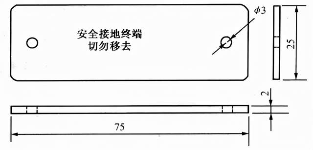 配电金属线管、金属线槽、电缆桥架等应作等电位连接。等电位连接处应悬挂警告性告示牌,警告牌由白色塑料制成,上面印有红色字样。金属线管等电位连接如图6所示,接地警告性告示牌如图7所示。
