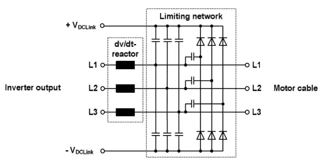 带VPL的dv/dt滤波器由两个部件组成,即dv/dt电抗器和电压限幅网络(峰值电压限制器)