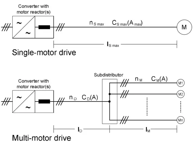指定的电机电缆长度始终是指逆变器输出与电机之间沿电缆路线的距离,并且已经考虑到在较高功率范围内的驱动器必须并联几根电缆。建议的和最大的可连接横截面以及电机电缆允许的并联数量在变频器中都应有规定值。大部分品牌产品可以在其样本中找到这些数值。 驱动多个电机时允许的电机电缆长度 通常单个电机连接到变频器输出端。然而还有一些应用,如集装箱起重机上的滚轮驱动或龙门驱动应用中需要大量相同的小功率的电机,由一个大功率变频器驱动。这种类型的配置称为“多电机驱动”。 对于多电机驱动,必须始终安装出线电抗器(或出线滤波器)。由于电机的额定功率较低,因此各个电动机都是通过截面很小的电缆连接的。这些电缆单位长度的电容明显低于用于单电机驱动的大截面电缆电容。由于单位长度的电容减小,多电机驱动的每个变频器输出的总允许电缆长度可以大大超过上面规定的值,而不违反变频器和电机电抗器规定的最大允许电容值。 下面描述一种根据单电机驱动的样本中数据计算多电机驱动的允许电缆长度lM的方法。下图解释了单电机和多电机驱动所用的量和术语。