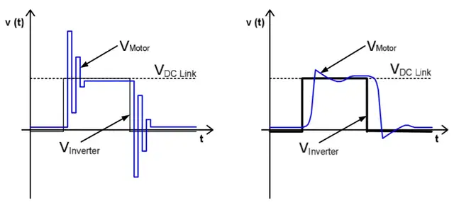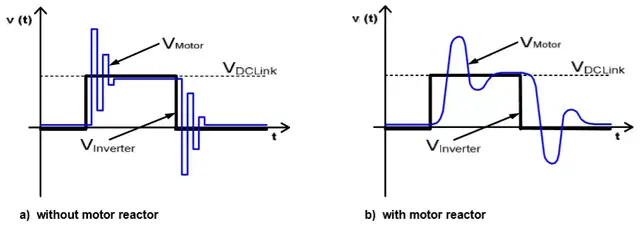 在没有出线电抗器的系统中,逆变器输出电压的dv/dt典型值为3-6kV/μs,它沿电缆以几乎不变的dv/dt向电机移动达到电机端子处。由此电压反射导致的电压尖峰,最高可达直流母线电压的两倍,见下图中的图a)。