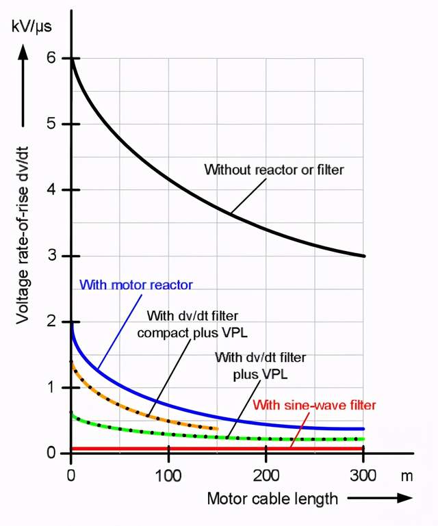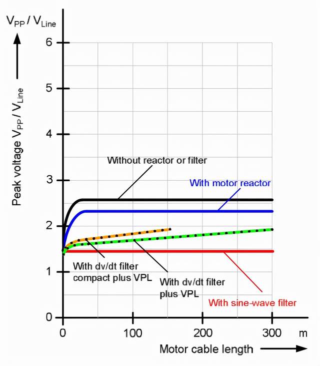 带VPL的dv/dt滤波器能够将峰值电压限制在低于IEC/TS60034-17:2006规定的极限曲线的值(VPP<1350 V),并且带紧凑型VPL的dv/dt滤波器能够将峰值电压限制在低于IEC/TS60034-25:2007规定的极限曲线A的值(VPP<1560 V)。
