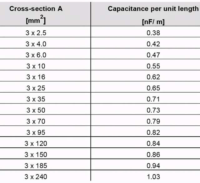 由于公式中只与不同横截面的电机电缆的电容值之比有关,而与绝对电容值本身无关,因此下表中类型NYCWY的电缆不同横截面的单位长度电容值可用于本计算中的所有屏蔽和非屏蔽电缆类型。