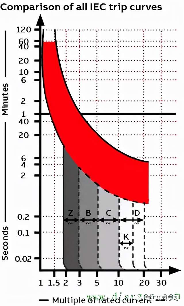 脱扣曲线的概念起源于IEC世界,用于对来自IEC标准的微型断路器(B、C、D、K和Z)进行分类的字母代码,该标准定义了跳闸的下限和上限,但制造商可以灵活地决定在这些阈值内会导致其产品跳闸的精确规格,脱扣曲线图显示了制造商可以设置其断路器的各个跳闸点的公差带。