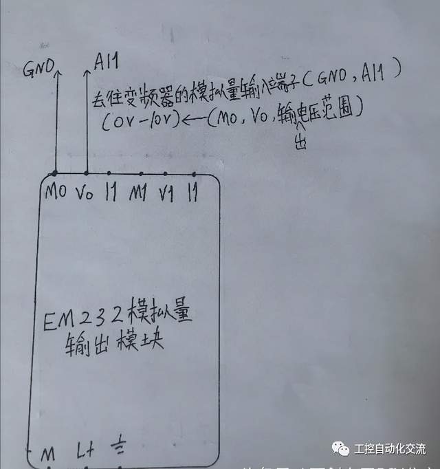 变频器端子(AI1)AI是Analog input 模拟量输入的缩写,1表示通道1!那么EM232模块与变频器是怎么连接的呢?我给大家画出了电路
