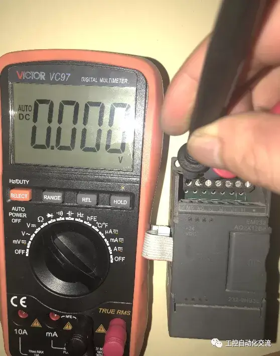 为了排除线断的可能,在人机界面设定好速度后,我用万用表测量EM232模块端子M0和V0是否有电压输出!结果测得电压为0V,这也排除了线断的可能!(由于当时拍照灯光问题看不清楚,只能给大家模拟一下)