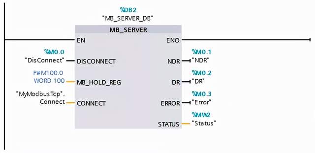 (四)服务端编程(1)调用 MB_SERVER 指令,使能 Modbus TCP 服务器功能:本例中 MW 100 映射为 40001;MW102 映射为 40002...
