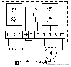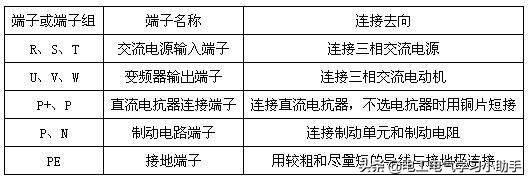 各种变频器主电路的对外连接端子大致相同,如图2所示。其中,R、S、T是变频器的电源端子,接至交流三相电源;U、V、W为变频器的输出端子,接至电动机;P+是整流桥输出的+端,出厂时P+端与P端之间用一块截面积足够大的铜片短接,当需要接入直流电抗器DL时,拆去铜片,将DL接在P+和P之间;P、N是滤波后直流电路的+、-端子,可以连接制动单元和制动电阻;PE是接地端子。 变频器主回路对外连接端子的标记符号、端子名称以及连接去向见表1。 表1 变频器的主回路端子