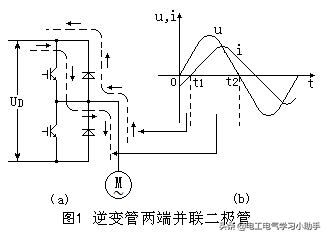逆变电路的每个逆变管两端,都要反向并联一个二极管,如图1(a)所示。其作用描述如下:异步电动机的定子电路是感性电路,其电流的变化滞后于电压,如图1(b)所示。图中: 0~t1时间段,电流i与电压u的方向相反,是绕组的自感电动势克服电源电压在作功(磁场作功)。这时的电流将通过反并联二极管流向直流回路。 t1~t2时间段:电流i与电压u的方向相同,是电源电压克服绕组的自感电动势在作功(电源作功)。这时的电流是通过逆变管流向电动机的。 如果没有反向并联的二极管,则因为逆变管只能单方向导通,绕组的磁场无法与电源(变频器中的直流电路)交换能量,电路的工作将发生畸变。