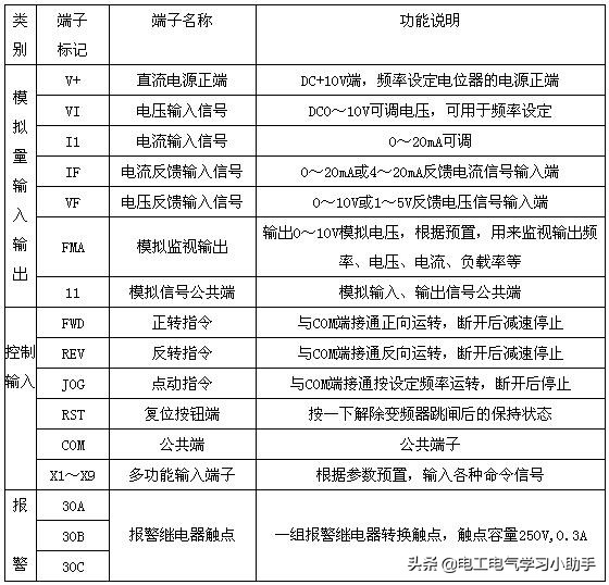 不同变频器配置的控制端子数量及标记名称略有不同,但其基本功能大体类似。表2给出了各种变频器几乎都在使用的控制端子,变频器独有的控制端子可参阅产品说明书。 表2 变频器的控制回路端子