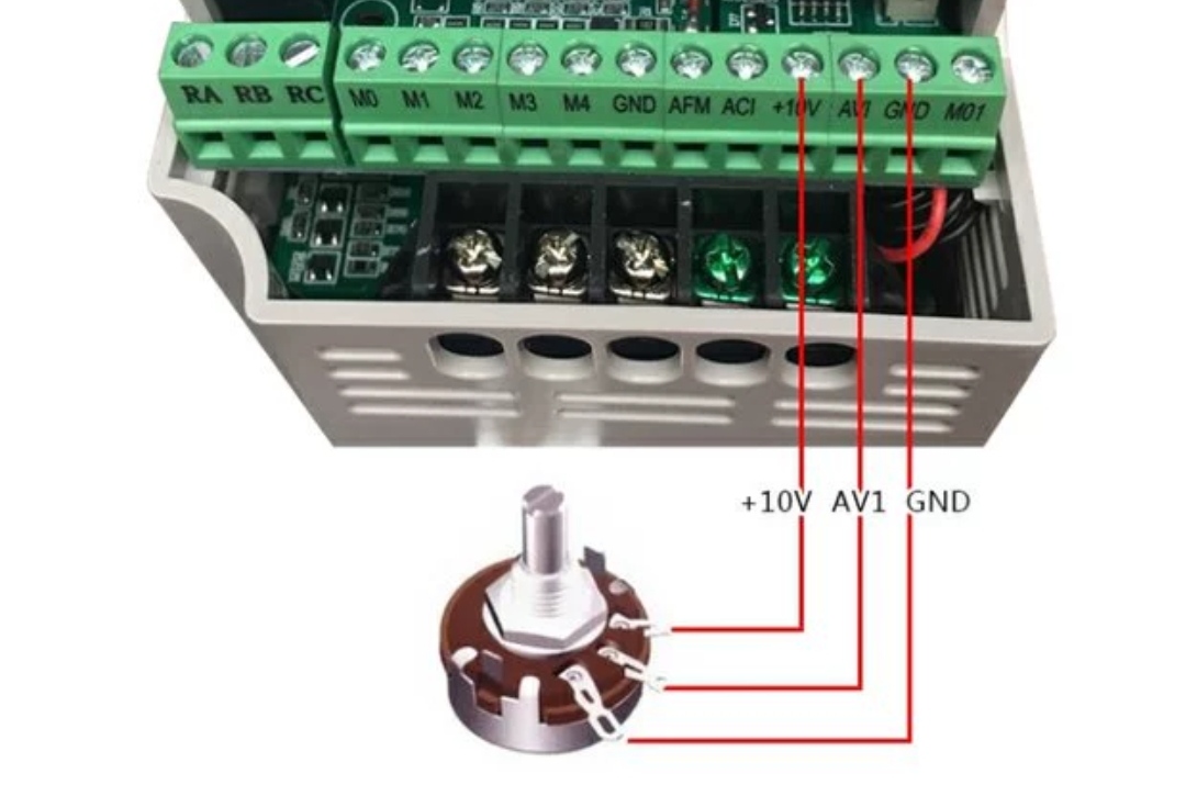 5.电位器接+10、AV1、GND端子,用以调节电机电源频率。  电位器接发