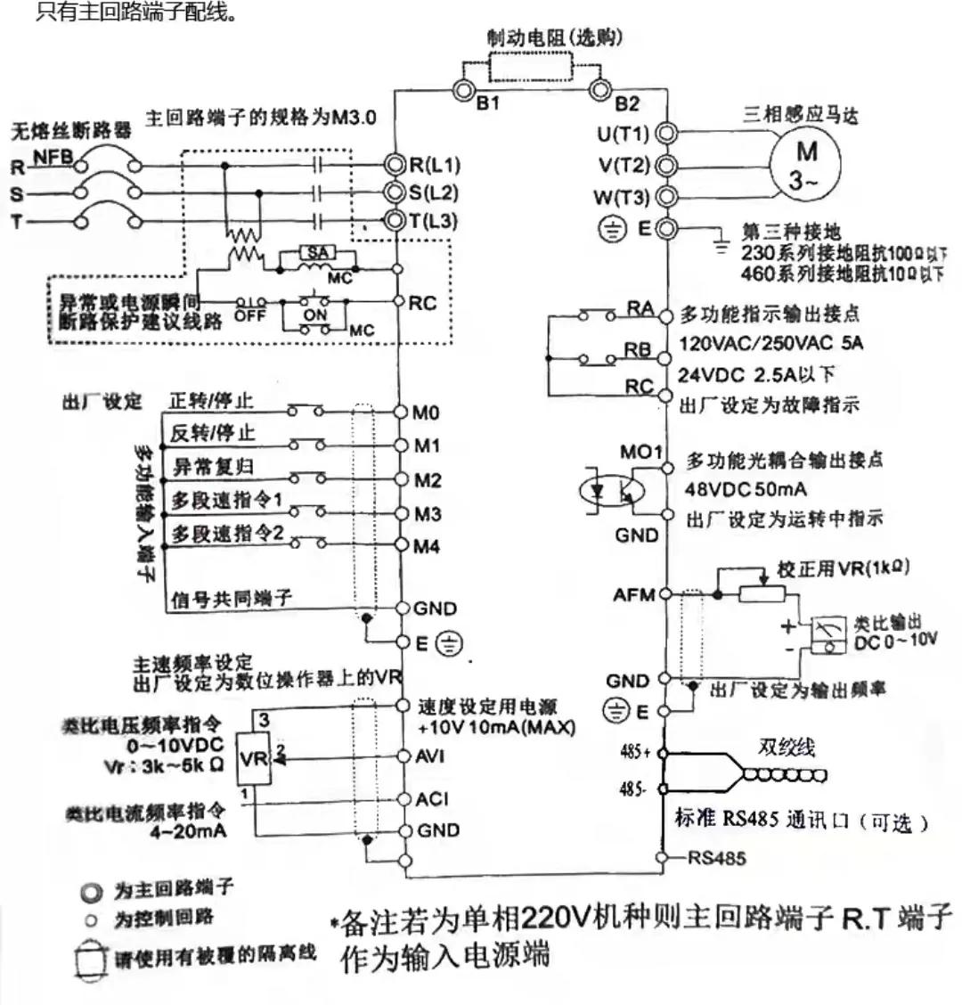 1.变频器电源,R、S、T为输入三相380V电压。根据变频器输入电压的多少接相应的电源,变频器常用输入电压有单相220V,三相380V。输入单相220V,输出三相220V电压。输入三相380V电源,输出三相380V电压。 2.输出电源U、V、W接电机,根据电机的输出电压,考虑电机线圈绕组方式,是否与变频器输出电压相符合。 3.B1、B2为制动电阻接线,停止时,可以快速停下,对于制动没有要求的设备可以选择不接,自由停车。 4.M0、M1为正反转控制信号,当M0与GND短接时,电机正转,M1与GND短接,电机反转。可以根据设备需求选择电机正转还是反转信号。M0、M1与GND短接可以选用继电器启、保、停的控制电路。  继电器启、保、停