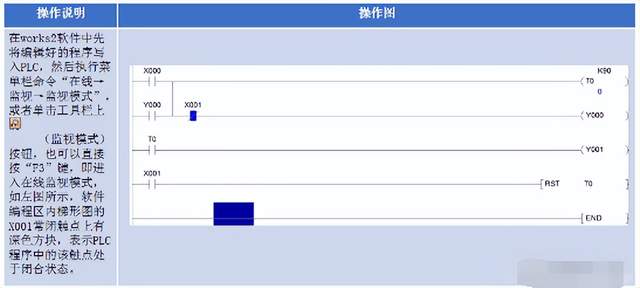 在线监视PLC程序的运行 在works2软件中将程序写入PLC后,如果希望看见程序在实际PLC中的运行情况,可使用软件的在线监视功能,该功能使用时,应确保PLC与计算机间通信电缆连接正常,PLC供电正常。