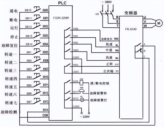 3.编写PLC控制程序 变频器有关参数设置好后,还要用编程软件编写相应的PLC控制程序并下载给PLC。PLC控制变频器驱动电动机正反转的PLC程序如下图所示。 PLC控制变频器驱动电动机多档转速运行的电路、程序及参数设置 变频器可以连续调速,也可以分档调速,FR-500系列变频器有RH(高速)、RM(中速)和RL(低速)三个控制端子,通过这三个端子的组合输入,可以实现7档转速控制。如果将PLC的输出端子与变频器这些端子连接,就可以用PLC控制变频器来驱动电动机多档转速运行。 1.PLC与变频器的硬件连接线路图 PLC以开关量方式控制变频器驱动电动机多档转速运行的线路图如下图所示。