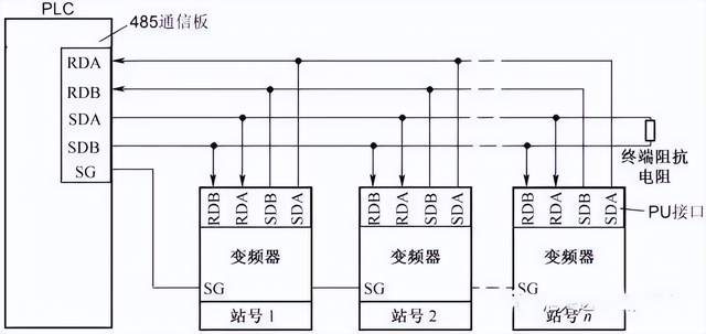 (2)多台变频器与PLC的RS485通信连接 多台变频器与PLC的RS485通信连接如下图所示,它可以实现一台PLC控制多台变频器的运行。