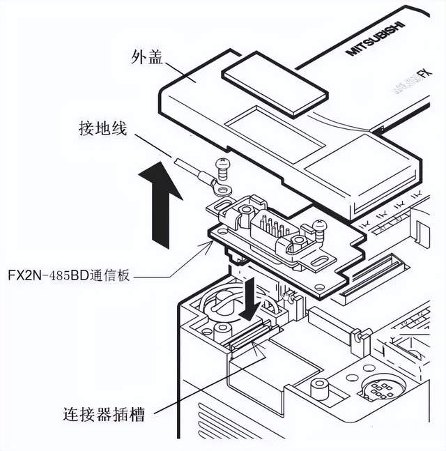 2.PLC的RS485通信口 三菱FX PLC一般不带RS485通信口,如果要与变频器进行RS485通信,须给PLC安装FX2N-485BD通信板。485BD通信板的外形和端子如下图(a)所示,通信板的安装方法如下图(b)所示。