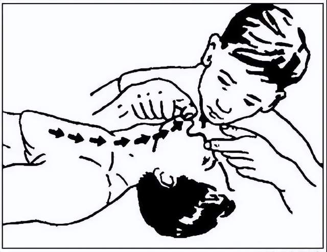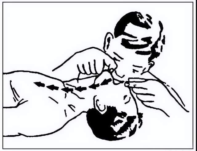 图8 迅速放松 施行上述两种急救方法时,如双人抢救,每做胸外心脏挤压 5次后由另一个吹气 1 次 (5∶ 1),反复进行;如只有一人,又需同时采用两种方法,可以轮番进行,做胸外心脏挤压15次以后,吹气 2次 (15∶ 2)。 为便于记忆,上述两种方法的操作要领总结成口诀如下。 ①口对口人工呼吸法 清口捏鼻手抬颌, 深吸缓吹口对紧; 张口困难吹鼻孔, 五秒一次不放松。 ② 胸外心脏挤压法 掌根下压不冲击, 突然放松手不离; 手腕略弯压一寸, 一秒一次较适宜。 施行上述两种急救方法时,还应仔细观察触电者发生的一些变化,如: a.触电者的皮肤由紫变红、瞳孔由小变大,说明急救方法已见效; b.当触电者嘴唇稍有开口,眼皮活动或咽喉处有咽东西的动作,应观察其呼吸和心脏跳动是否恢复; c.触电者的呼吸和心脏跳动完全恢复正常时,方可中止救护; d.触电者出现明显死亡综合症状,如:瞳孔放大,对光照无反映,背部四肢等部位出现红色尸斑,皮肤青灰,身体僵冷等,且经医生诊断死亡时,方可中止救护。 6.外伤的处理 对于触电者电伤和摔跌造成的局部外伤,在现场救护中也应作适当处理,可防止细菌侵入感染及摔跌骨折刺破皮肤、周围组织、神经和血管,避免引起损伤扩大,同时可减轻触电者的痛苦和便于转送医院。 伤口出血,以动、静脉出血的危险性为最大。动脉出血,血色鲜红且状如泉涌;静脉出血,血色暗红且持续溢出。人体总血量大致有 4000 ~ 5000ml左右,如果出血量超过 1000ml,可能引起心脏跳动停止而死亡,因此,如触电者有出血状况要立即设法止血。常用的外伤处理方法有: a.一般性的外伤表面,可用无菌生理食盐水或清洁的温开水冲洗后,再用适量的消毒纱布、防腐绷带或干净的布类包扎,经现场救护后送医院处理; b.压迫止血是动、静脉出血最迅速的止血法,即用手指、手掌或止血橡皮带在出血处供血端将血管压瘪在骨骼上而止血,同时,速送医院处理; c.如果伤口出血不严重,可用消毒纱布或干净的布类叠几层盖在伤口处压紧止血; d.对触电摔伤四肢骨折的触电者应首先止血、包扎,然后用木板、竹竿、木棍等物品临时将骨折肢体固定并速送医院处理