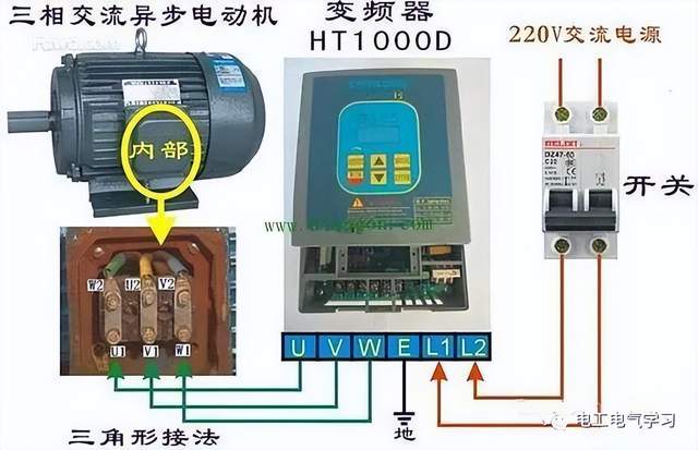 工业上用的变频器,分为单相和三相两种,这个是从主回路供电的电压来区分的,三相就是主回路要接入RST三相380伏交流电,输出接UVW三相线给电机;而单相是主回路接入单相220伏LN交流电,输出同样接UVW三相线给电机,变频器输入主回路和电网之间,需要通过空气开关来串入供电形成保护,不要使用漏电保护开关,否则无法正常工作,因为变频器漏电电流非常大。变频器输出端,需要直接和电机相连接,不要使用接触器之类的器件来串联使用,否则可能会因为触点造成压降引起电机工作不平衡。