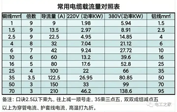在日常使用中,没有特殊情况,一般可以采用我上面的表格进行对照,根据这么多年的工作经验我认为还是可靠的。电线在使用时,并不推荐满载运行,最少要保留20%的安全余量。