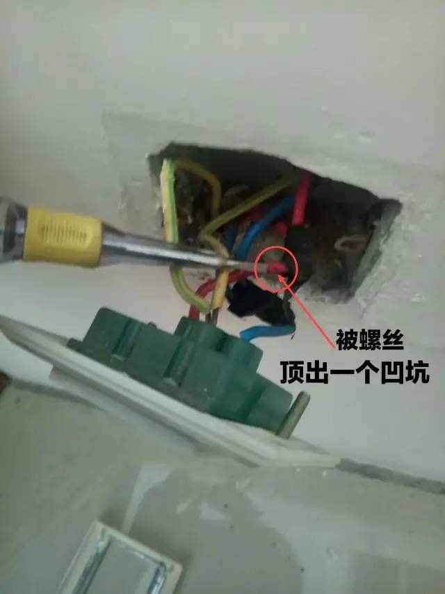 经过反复观察暗盒与电线,发现火线绝缘层上有一个小凹坑,不仔细观察还看不出来。根据凹坑的形状和位置,应该是固定插座的螺丝顶出来的。就是这个凹坑导致绝缘层变薄了,另外绝缘层的绝缘性能不好,虽然没有破皮,但是会有一些漏电的问题。所以火线对地漏电非常轻微,一天几个小时跳一次。