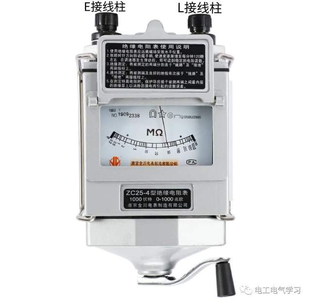 兆欧表 兆欧表的E、L接线柱,接入测线棒,两个测线棒的测量方式与万用表表笔测量电机方式相同,兆欧表没有档位调节,只要以每分钟120转摇动手摇杆即可。 单相电机单相电机通常只有两组线圈,分别为主绕组、副绕组。副绕组启动,主绕组运行。在电机内部,主绕组与副绕组为串联关系,连接处引出一根线,单相电机一般引出三根线,可以用①②③三个线头表示。