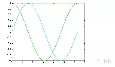 plot(x, sin(x), 'c', x, cos(x), 'g');