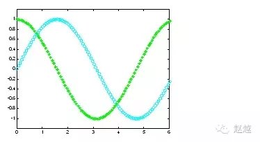 plot(x, sin(x), 'co', x, cos(x), 'g*');