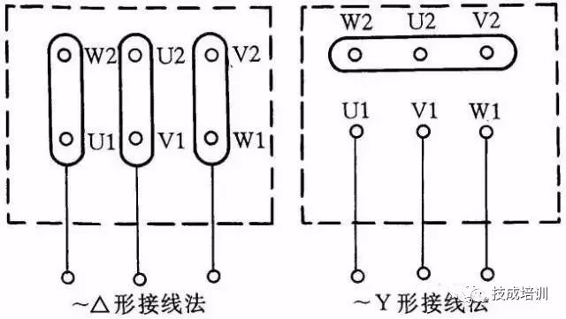 目前,Y系列电动机被广泛应用。Y系列电动机具有体积小、外形美观、节电等优点。它的接线方式有两种:一种为△形,它的接线端子W2与U1相连,U2与V1相连,V2与W1相连,然后接电源;另一种为Y形,接线端子W2、U2、V2相连接,其余3个接线端子U1、V1、W1接电源。接线见图6。