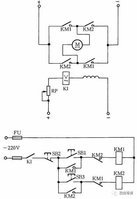 在励磁电路内,串联一个欠电流继电器KI,其常开触点接在控制电路中。当励磁电流消失或减小到设定值时,KI释放,KI常开触点断开,切断电动机电枢电源,使电动机停转,从而避免超速现象发生,见图11。