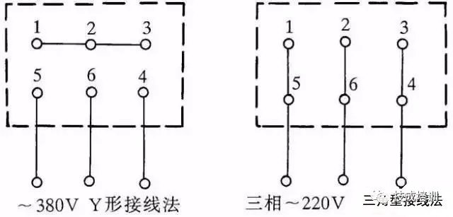 有部分三相吹风机有6个接线端子,接线方法如图2所示。采用△形接法应接入220V三相交流电源,采用Y形接法应接入380V三相交流电源。一般3英寸、3.5英寸、4英寸、4.5英寸的型号按此法接。其他吹风机应按其铭牌上所标的接法连接。