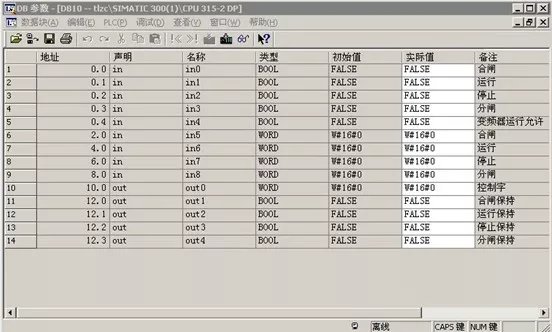 A #TEMP20 = L 46.0 BLD 103 A #TEMP21 = L 46.1 BLD 103 A #TEMP22 = L 46.2 BLD 103 A #TEMP23 = L 46.3 BLD 103 A DB1.DBX 6.0 = L 46.4 BLD 103 CALL FB 1 , DB10 in0 :=L46.0 in1 :=L46.1 in2 :=L46.2 in3 :=L46.3 in4 :=L46.4 in5 :=W#16#1477 in6 :=W#16# 147F in7 :=W#16#1477 in8 :=W#16#1476 out0:=PQW280 out1:=DB1.DBX1500.1 out2:=DB1.DBX1500.3 out3:=DB1.DBX1500.5 out4:=DB1.DBX1500.7 NOP 0 从这个程序我们可以看出,入口参数和出口参数传递的是实时的数据而不是地址。如图所示: 由此可以看出,FB功能块的处理方式是围绕着数据块处理数据,它的输入输出参数都是数据块里的数据,以及STAT的数据都是数据块里的,入口参数和出口参数,这些数据不会因为函数消失而消失,它会一直保持在数据块里。6#1477 in6 :=W#16# 147F in7 :=W#16#1477 in8 :=W#16#1476 out0:=PQW280 out1:=DB1.DBX1500.1 out2:=DB1.DBX1500.3 out3:=DB1.DBX1500.5 out4:=DB1.DBX1500.7 NOP 0 从这个程序我们可以看出,入口参数和出口参数传递的是实时的数据而不是地址。如图所示: 由此可以看出,FB功能块的处理方式是围绕着数据块处理数据,它的输入输出参数都是数据块里的数据,以及STAT的数据都是数据块里的,入口参数和出口参数,这些数据不会因为函数消失而消失,它会一直保持在数据块里。