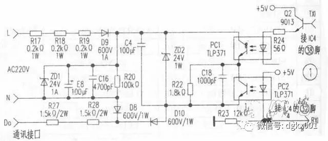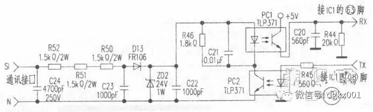 分析与检修:查该机型故障代码含义得知,属通讯不良(电路见图1、图2)。先用万用表直流电压挡测量室外机接线端子②脚(N)和④脚(S1)间无(约为40V的)脉动电压,后测量室内、室外机通讯电路+5V、+24V电源均正常;再用万用表电阻挡检测联机线均无断线、接错位或接触不良等现象,由此怀疑通讯电路元件存在不良。接着在断电的情况下用万用表电阻挡分别检查光电耦合器PC1、PC2和IC1、IC2,发现IC2性能不良,并用同规格的更换,再通电开机后整机恢复正常运转,故障排除。