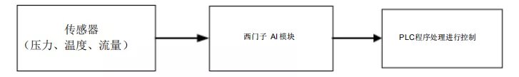 模拟量 AI 采用 SM311 模块是 8x12Bit(8 通道 12 位)对应货号是 6ES7 331-7KF02-OABO,在模数转化上利用传感器或变送器的, 电压或电流取出的值,到 AI 模块上进行转换, 然后把值传给西门子的 CPU 进行处理, 从而检测控制传感器的值,如图
