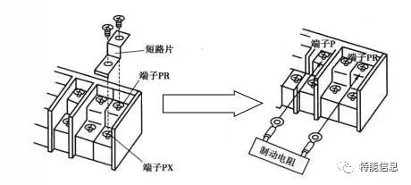 电源、电动机与变频器在连接时,要注意电源线绝对不能接U、V、W端,否则会损坏变频器内部电路,由于变频器工作时可能会漏电,为安全起见,必须将接地端子与接地线连接好,以便于泄放变频器漏电电流。 五、选件的连接 变频器的选件较多,主要有外接制动电阻,制动单元,提高功率因数整流器,能量回馈单元和改善功率因数直流电抗器等。下面介绍常用的外接制动电阻和直流电抗器的连接。 1、外接制动电阻的连接 变频器的P、PX端子内部接有制动电阻,在高效率制动时,内置制动电阻易发热,由于封闭散热能力不足,这时需要安装外接制动电阻替代内置制动电阻,外接制动电阻的连接如下图所示,先将PR、PX端子间的短路片取下,然后用连接线将制动电阻与PR、PX端子相连。