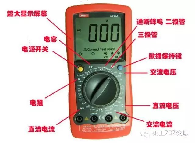 万用表能测量直流电流、直流电压、交流电压和电阻等,有的还可以测量功率、电感和电容等,是电工最常用的仪表之一。