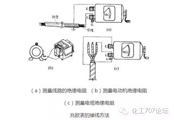 将兆欧表E接线柱接机壳(即接地),L接线柱接到电动机某一相的绕组上,如上图b所示,测出的绝缘电阻值就是某一相的对地绝缘电阻值。