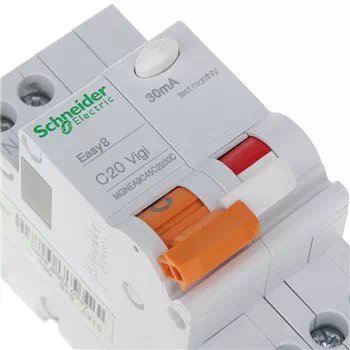 漏电保护器、漏电开关都是比较旧的说法,现在标准的叫法应该是「剩余电流动作保护器」,简称 RCD。RCD 并非单独使用,而是与断路器(也就是俗称里「电闸」的那个「闸」)配合使用。一般家用的带 RCD 的断路器是这样的: