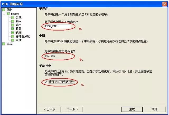 第七步:定义向导所生成的PID初使化子程序和中断程序名及手/自动模式