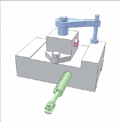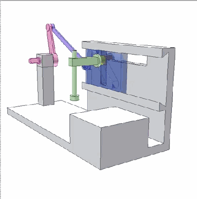 该机制可用于:粉色条向下移动以拾取工件,向上移动,向右旋转90°。向右移动,释放工件并返回初始位置。