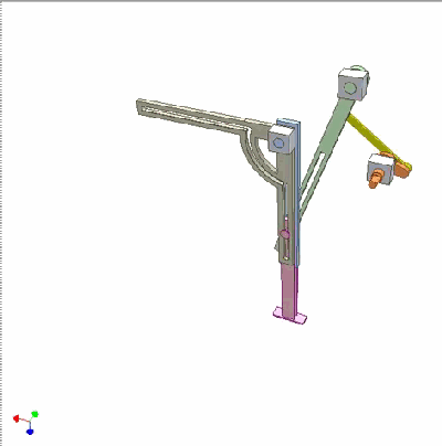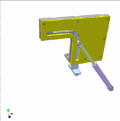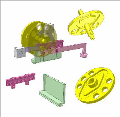 3、抓取机构3 粉色曲柄有规律地转动,使蓝色杆的粉色销沿着黄色板的槽移动。同时,蓝色条的橙色针沿着灰色板的槽移动。换个角度再看一下: 该机制可用于以下场景:蓝色条向左移动以拾取工件,向右移动,旋转180°,向右移动,释放工件并返回初始位置。